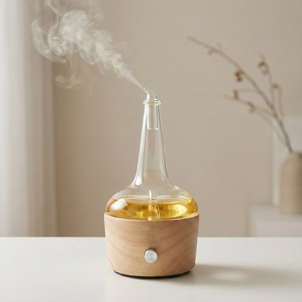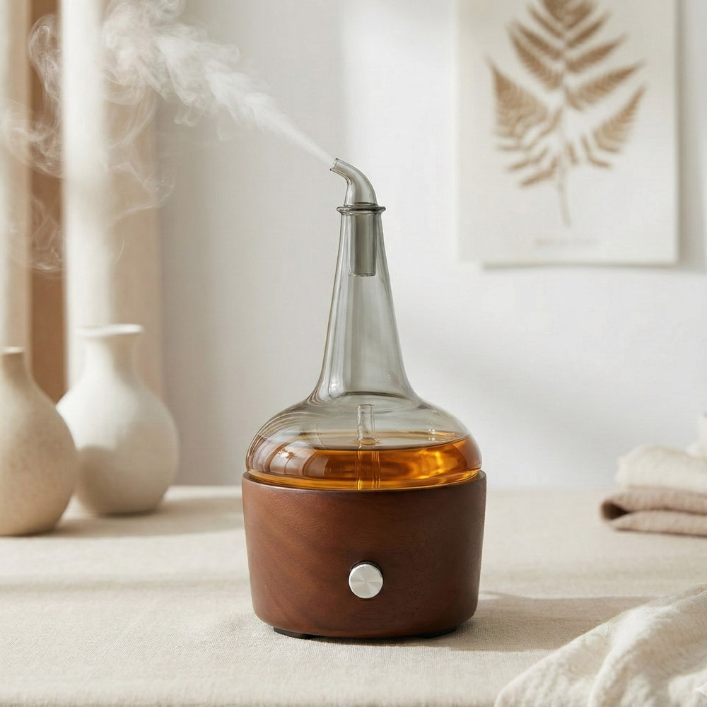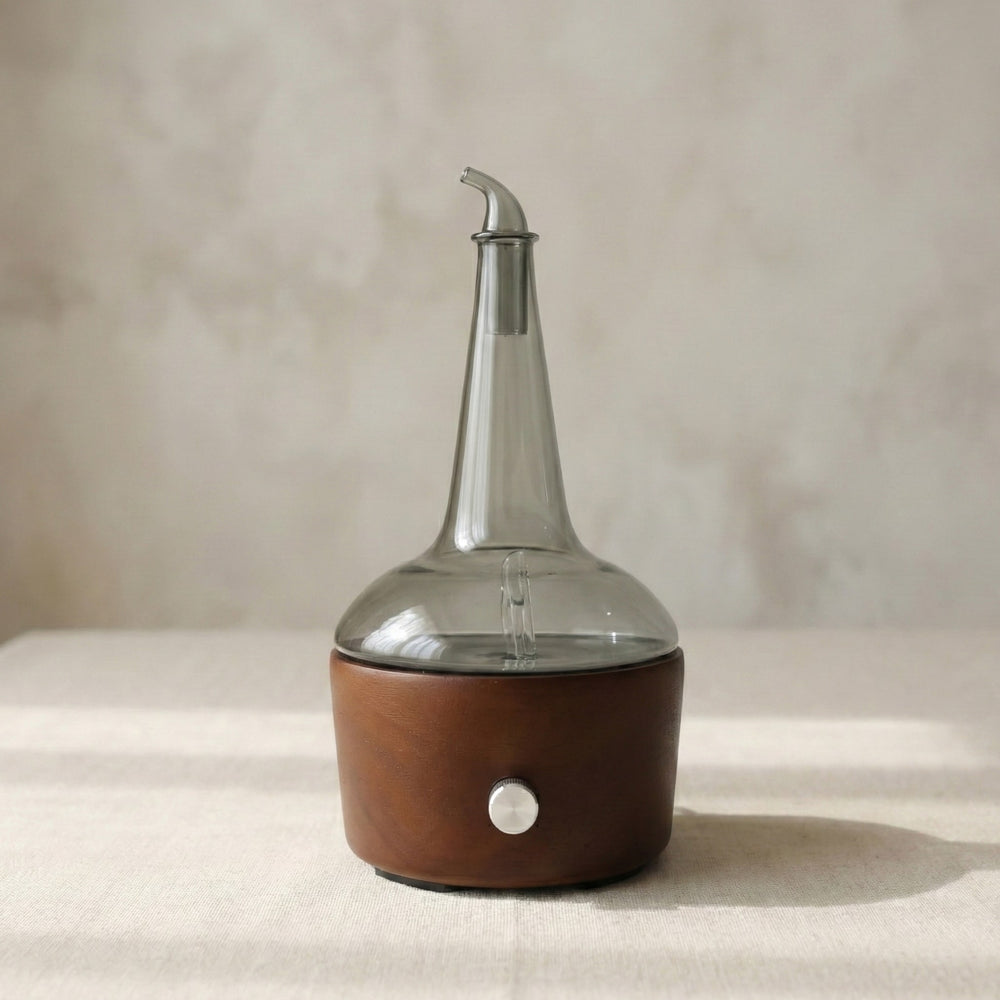 The Hand-Blown Glass (The Spirit): Rising from the wood, the clear glass spire represents the purity of the distillate. It allows for the unadulterated atomization of your whiskey's aroma—creating a "visible bouquet" without any interference.